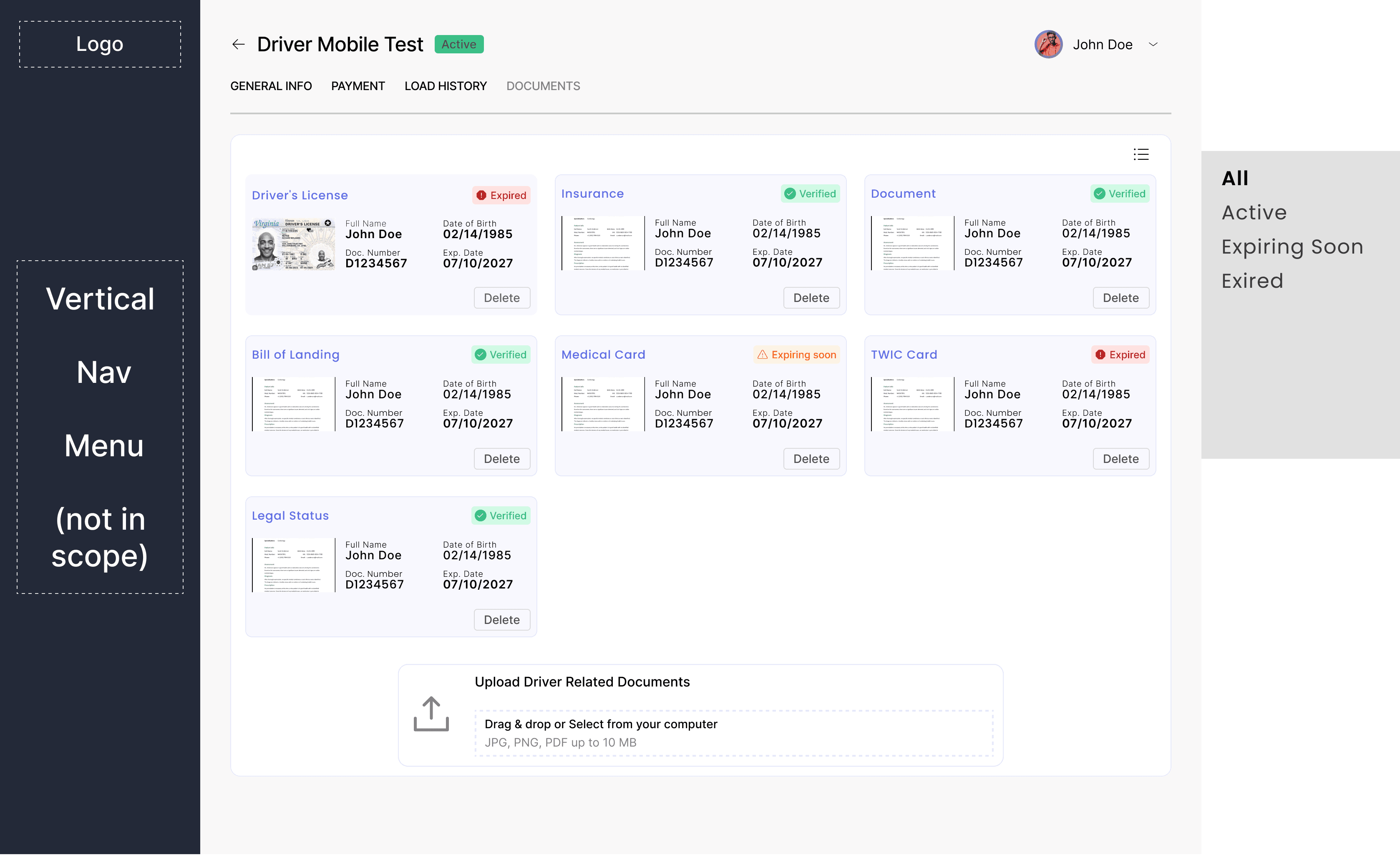 This screen provides a consolidated view of all driver-related documents, allowing users to quickly assess document status and compliance.